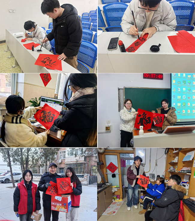 写福字送福字环节暖意融融。团员们分为三组,带着提前准备好的福字分别前往辅导办、教研室及附近小区。大家向辛勤付出的辅导员、授课教师送上节日祝福与福字,汇报学习近况;向小区老人们致以诚挚问候,传递青年一代的温暖与敬意,用实际行动践行志愿服务精神,拉近了与师长、社区群众的距离。