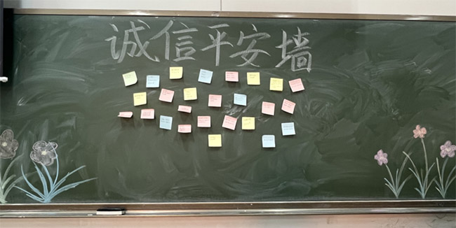 活动伊始,暖场破冰环节趣味十足。团员们手持彩色便利贴与彩笔,认真写下元旦祝福、平安校园承诺与诚信考试宣言。“愿新年皆安,考试无欺”“遵守校规校纪,共建平安校园”等真挚话语跃然纸上,大家有序将祝福签贴在教室后黑板打造的“诚信平安墙”上,瞬间营造出节日氛围与主题教育交织的浓厚氛围。