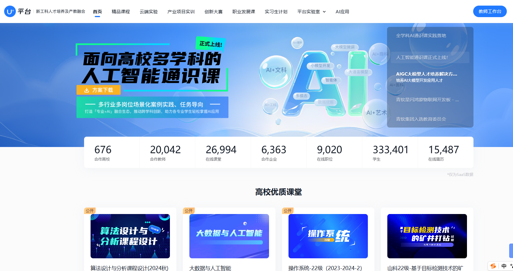 青软自主研发的U+平台汇聚500余门精品课程、300余个产业项目及2000余个行业实验案例,服务超30万在线用户,其AI驱动的教、学、评、测、练、管一体化能力,可精准适配本科与高职不同层次教学需求。未来希望能发挥技术中枢作用,成长为教育委员会教学资源落地的核心载体!