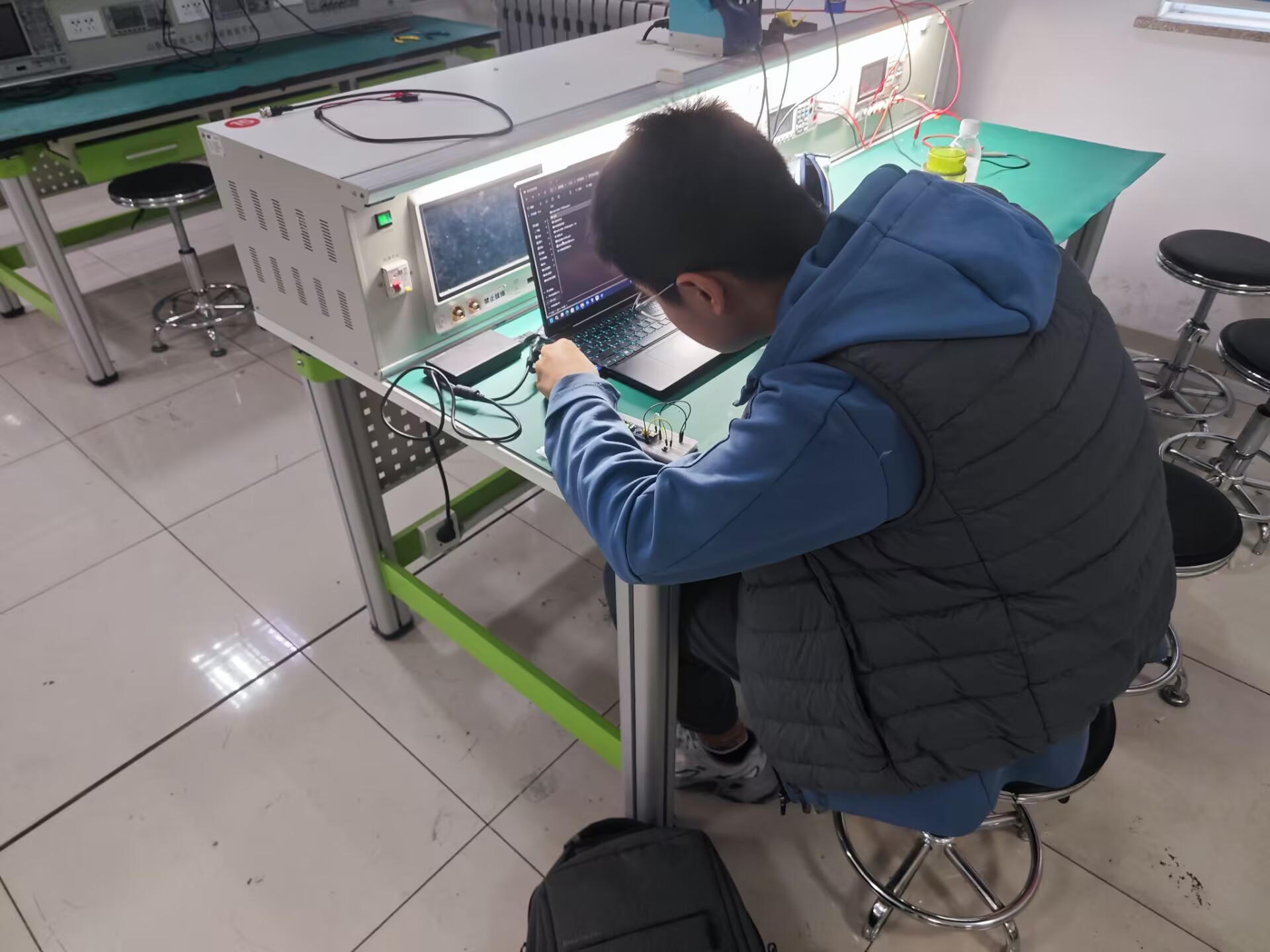 在动手实践的过程中,同学们在指导下相继完成了。“外部中断控制LED”、“使用定时器产生1s时钟”、“定时器做呼吸灯”等任务。在进行制作呼吸灯和PWM频率测量的实践时,同学们将电脑屏幕上抽象的代码与示波器中清晰可见的波形相结合,通过示波器观察波形变化,直观感受到参数调整对输出效果的影响,加深了软硬件协同的设计思维。