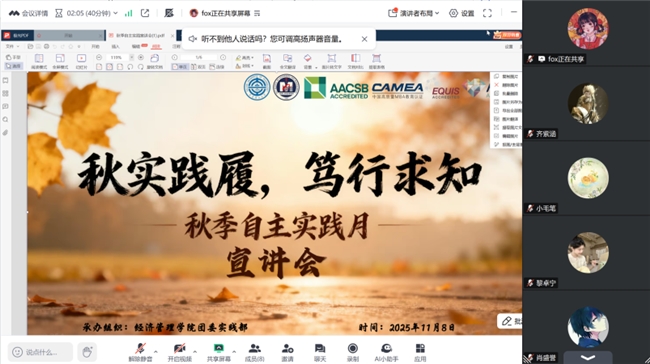 实践启动前,团队组织同听线上主题宣讲会,全面了解项目背景、调研目标与执行流程,明确以数据为支撑、以问题为导向的工作思路。随后在11月17日举行的前期线上会议中,成员围绕问卷结构、访谈对象、区域划分、数据分析方法等展开多轮讨论,细化任务分工,预设执行难点并制定应对策略,为后续实地调研打下扎实基础。