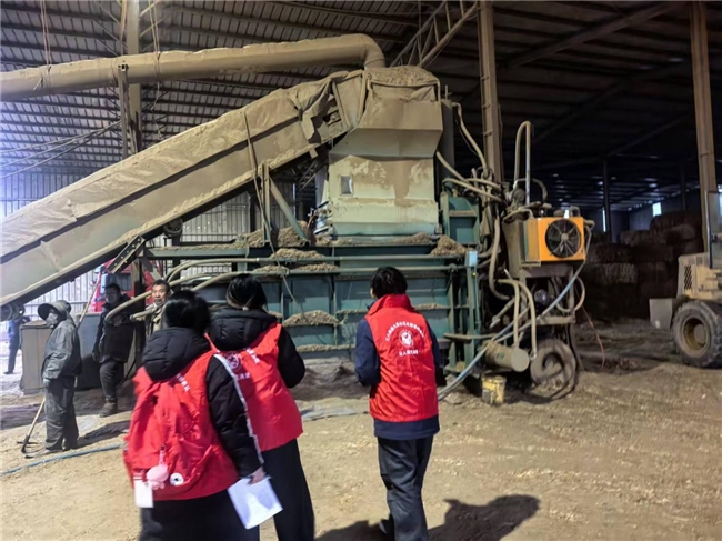随后,团队来到当地的秸秆综合利用专业合作社,亲眼见证秸秆如何通过规范化加工“变身”为优质饲料。车间内,机械轰鸣,秸秆经过解捆、粉碎、多级除尘、液压成型等工序,逐步转化为规格统一的饲料颗粒。合作社负责人介绍,他们根据秸秆品质进行分级利用,优质部分制成饲料,其余也各有用途,真正实现了“充分利用”。这一模式不仅提高了资源利用效率,还为周边村民提供了秸秆回收、运输、分拣等多个就业岗位,形成了“收集—加工—销售”的本地化小产业链。同学们感受到,小小秸秆背后连起的是农户增收、产业增效、乡村增益的良性循环。