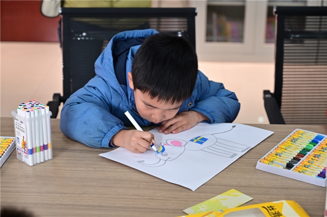 在“动物园有什么”主题课堂中,团队学子以生活为源头,引导孩子们细致观察动物形态、感知自然之美,帮助孩子们建立“源于生活、高于生活”的艺术认知,在艺术实践中涵养热爱自然、敬畏生命的真挚情怀;在“福字绘画”环节,学子们以笔为媒、以墨传情,带领孩子们一笔一画勾勒汉字韵味,手把手传授书法技巧,让孩子们在笔墨书香中感受中华汉字的独特魅力,体悟传统年节文化的深厚底蕴,让传统书法成为连接情感与文化的桥梁,推动中华优秀传统文化的传承与弘扬;“创意拼贴画”课堂打破纸笔边界,鼓励孩子们大胆突破思维局限,运用多元材料表达心中想象,在“撕、贴、拼”的实践过程中释放创造力、激发表现力,培养创新思维与动手能力;“情绪小怪兽”绘本课程以色彩为媒介、以绘本为载体,巧妙融合美育与心理教育,引导孩子们识别情绪、表达心声、接纳自我,实现以美润心、以美养心,助力青少年身心健康成长。