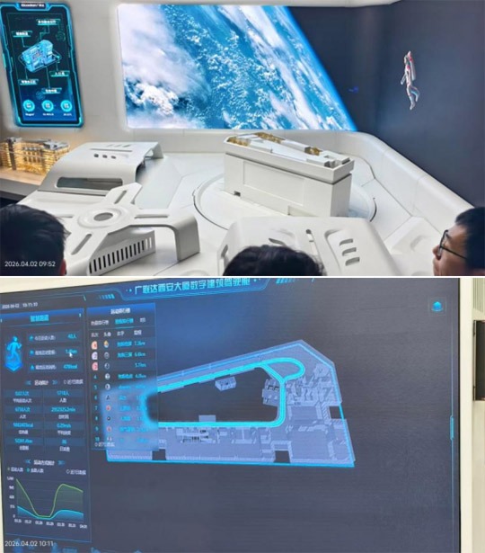 随后,师生们走进广联达数字建筑体验馆,开启了一场沉浸式的数字科技之旅。体验馆以"太空数字母舰"为设计理念,通过裸眼3D、智能沙盘、互动演示等多种形式,全方位展示了广联达在工程造价、智慧建造、数字孪生、建筑产业互联网等领域的核心技术与标杆项目。从智能造价系统的精准测算,到"BIM+智慧工地"的全流程数字化管理,再到北京大兴机场、芬兰赫尔辛基图书馆等全球知名项目的数字化实践,同学们近距离感受到了数字技术如何为传统建筑行业注入新的活力,对建筑产业的数字化转型有了更直观、更深刻的认识。