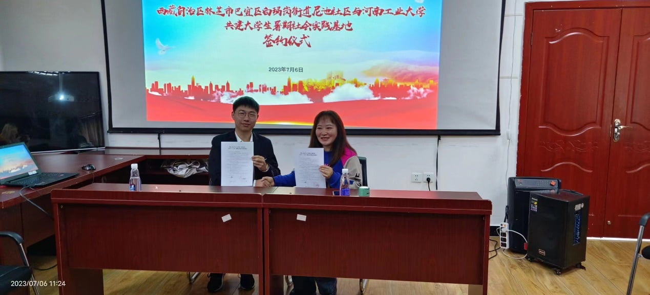 双方在经过对双方的需求的了解和商讨后,最终当场确定河南工业大学代表方对建立大学生社会实践基地后,将为当地提供学生的一些帮助以及可以进行的一系列社会实践志愿活动,同时也针对在当地进行社会实践时的一些要求进行了明确说明。两方会谈期间,社区工作人员表示对合同内容中的“暑期社会实践团队”很是满意和欣慰,交流过程气氛也是热烈愉快。建立 “河南工业大学大学生暑期社会实践活动基地”,希望能使双方都充分发挥了各自的优势、团结民族力量,进行资源共享,达到优势互补、共同进步的局面。