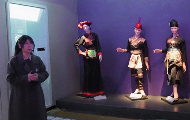 (图为实践队员在畲族服饰展区观察完整的女性传统服饰。)