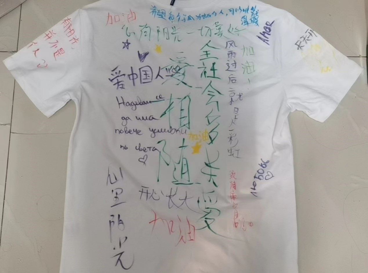 除了义卖,一位身穿白色文化衫的队员也手持画笔穿入人群,每一次驻足都在渴求爱的回应:“请您在空白处写下想对孤独症孩子们说的话”。那个午后,五彩的笔迹由中文、英文、俄文和葡萄牙文交织而成,绘成一片绵软的爱意。语言不通,心意相通。前人温暖的话语,也给了后人提笔鼓励的勇气。