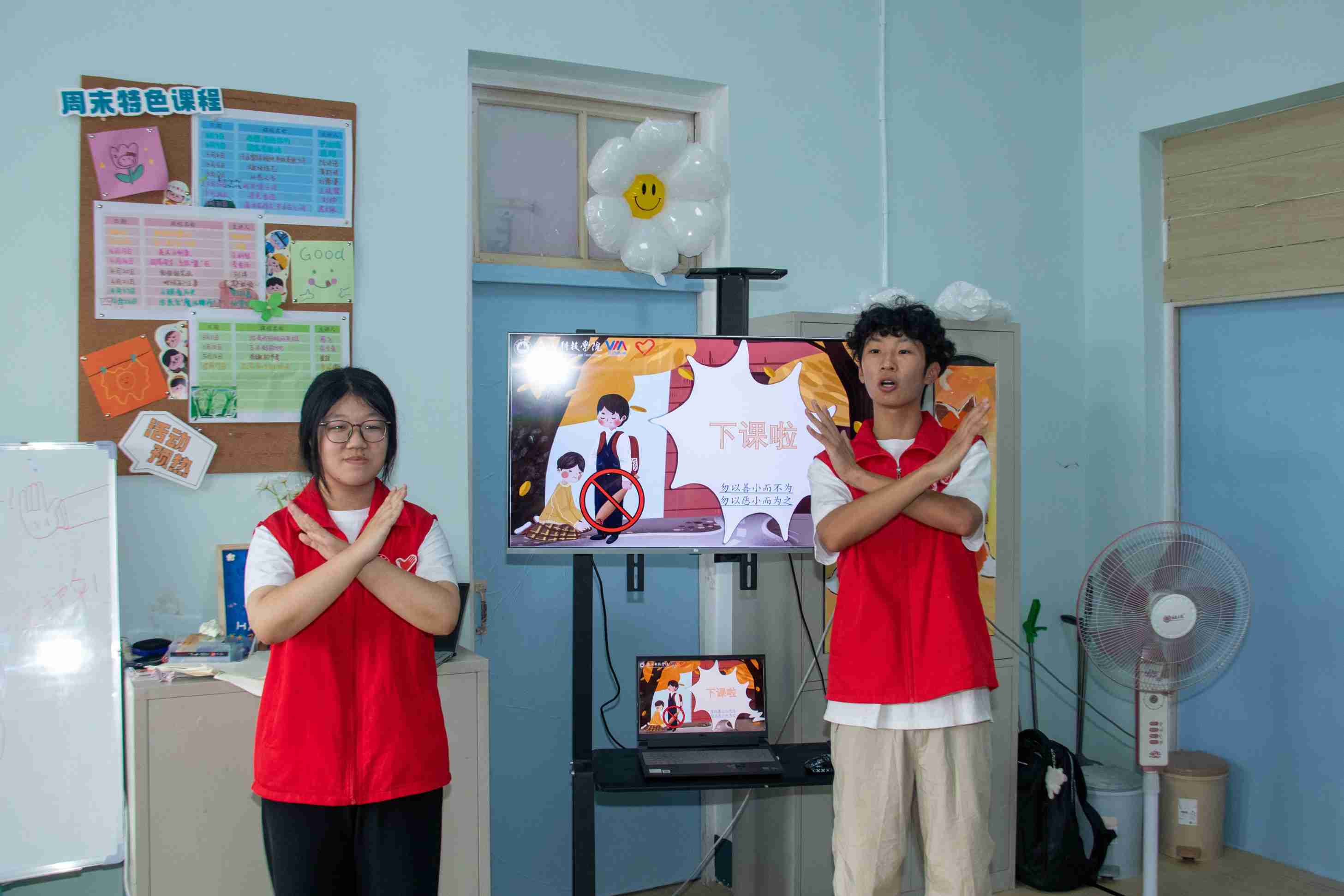实践团成员宋策、钱思彤为小朋友们普及安全知识,从防溺水、生活安全、反诈骗三方面入手,为小朋友们营造健康成长的环境。