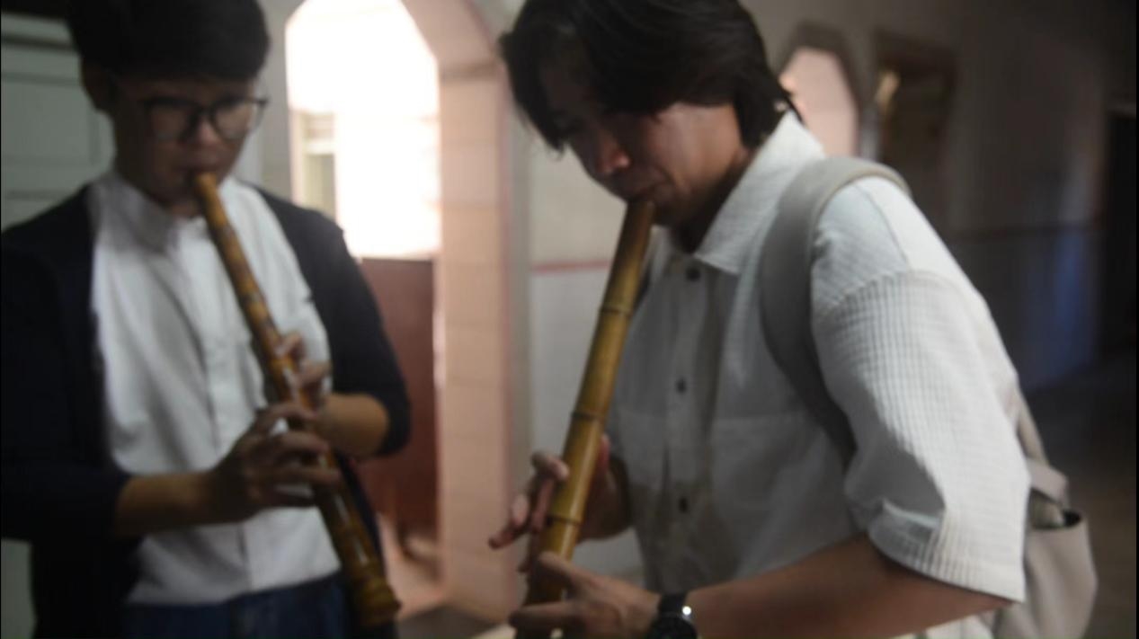 【图为陈荣焜、陈瑞亲自体验南音洞箫 任菲雨摄】