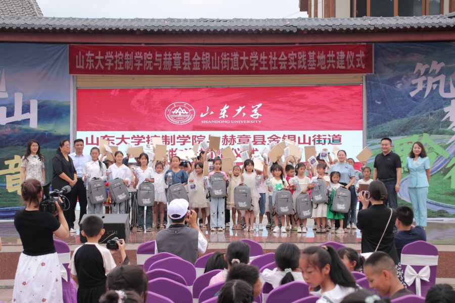 在授牌与物资交接仪式上,控制学院正式向金银山少儿活动中心授予学生实践基地牌匾,并向金银山扶贫安置点的易地扶贫搬迁家庭儿童捐赠了水彩笔、画本等画材各110套以及“两弹一星”主题书包等物资。这些实际行动不仅助力了农村儿童的爱心关怀事业,也体现了学院对基层教育的深切关怀。