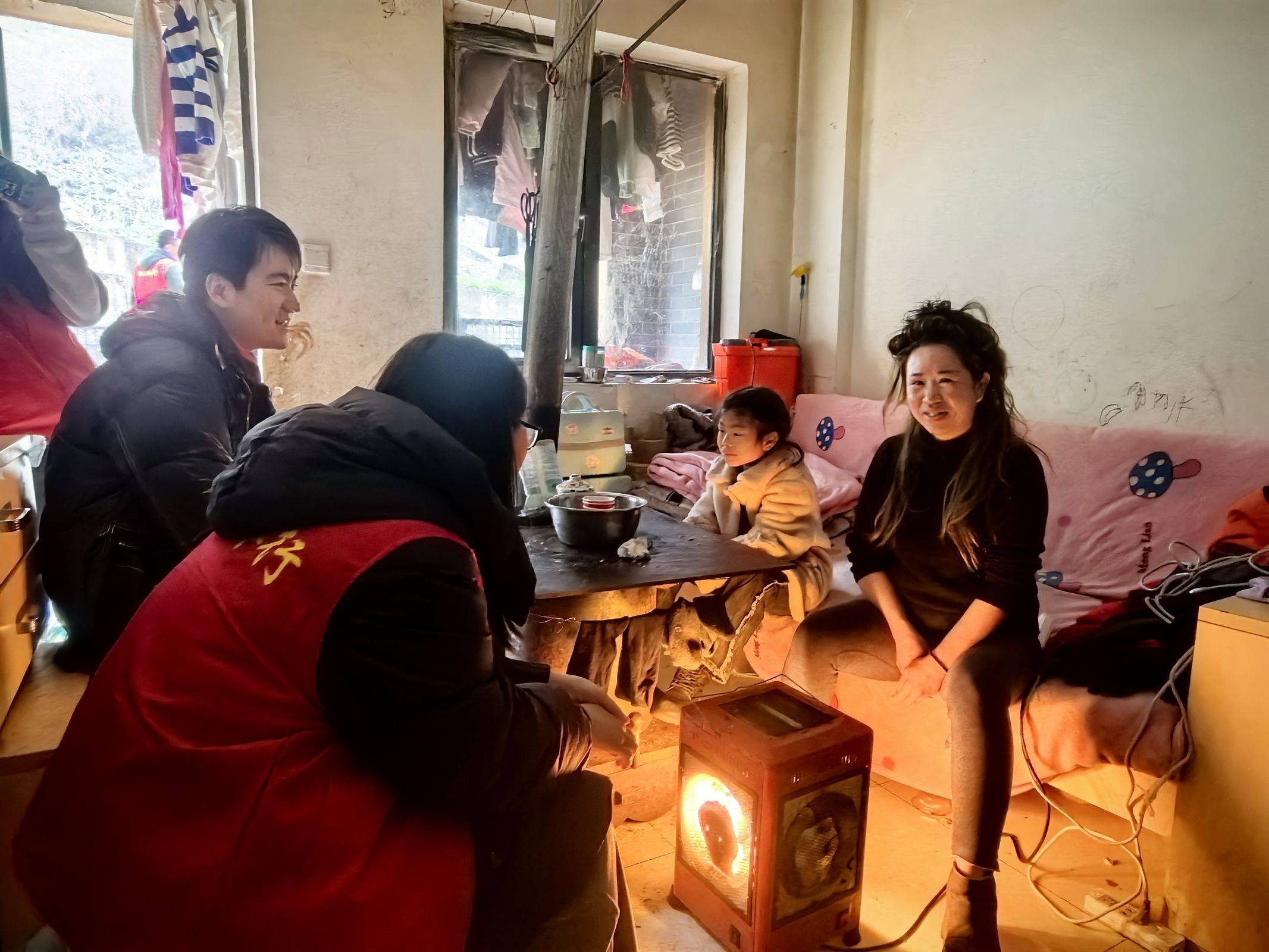 一家离异重组家庭给队员们留下了深刻印象。妈妈热情招呼队员们进屋坐下,年龄不大的几个孩子满地跑,妈妈愠怒地呵斥他们“别捣乱小心挨揍!”转身又略带歉意地笑着对队员们说“娃娃有点调皮,但都是好孩子。”队员们向这位曾独身前往万里以外讨生计养活家庭的妈妈讲小女孩的课堂表现,她十分乖巧文静,会把自己做的手工送给老师做礼物。围坐在炉火边,妈妈看着身边的孩子露出了骄傲的笑容……