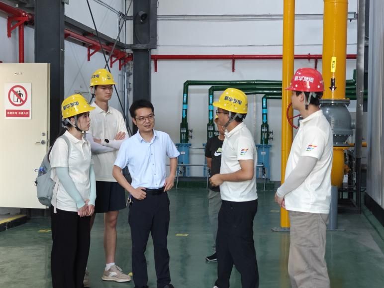 走进生产一线,助力节能生产。在调研的最后环节,肖部长邀请团队成员前往生产现场参观。服务团成员走进新华能源生产现场,先后参观了锅炉房及硬水软化处理系统,进一步深入了解企业能源系统的实际运行机制。锅炉作为发电系统的核心设备,其运行状态直接决定了系统的热效率与电能输出能力。讲解人员介绍道,该公司采用的工业锅炉以天然气为主要燃料,可以最大实现45t/h的蒸汽产量。在火电站蒸汽资源不足时,可以作为有效补充手段,确保供热充足。在现场走访阶段,团队结合专业知识,指出使用天然气需要注意通风,避免天然气堆积导致安全事故,现场的卢工介绍公司在这方面做的改进工作。同时,团队成员发现目前公司使用的锅炉设备出水温度在100℃以上,为此,团队成员提出,这个温度与居民部门常用的温度(60/70℃)存在一定的温差区间,具有较好的余热利用潜力,后续公司可考虑在余热方面进行进一步工作。