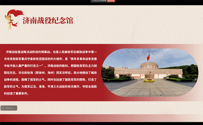 济南战役纪念馆坐落于英雄山风景区,是全国爱国主义教育示范基地,以“铭记历史、致敬英雄”为主线,系统展示1948年济南战役的壮阔历程。支部成员在线上展厅中重点参观“战役决策”“攻城激战”“胜利曙光”等展区,走进当年的攻城突破口,聆听“济南第一团”“济南第二团”的英勇事迹。