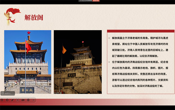 这座巍峨的建筑不仅是济南解放的永恒标志,更是一座城市记忆的丰碑。通过线上参观,团员们了解了它在现代表达中传承历史的重要作用,深刻感受到济南人民对解放事业的永恒铭记。解放阁的存在,无声地述说着那段烽火岁月,提醒着后人珍惜当下和平幸福的生活。“解放阁不仅是一座建筑,更是一座精神灯塔,时刻提醒我们珍惜当下、奋勇前行。”活动参与同学在活动后写道。