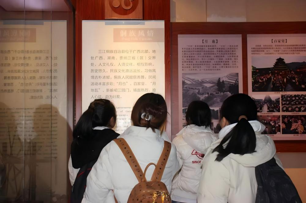 在展厅另一侧的“侗族风情”展板前,团队成员对照文字介绍,认真记录着各类民俗细节。“‘月也’是侗族集体做客的传统习俗,‘百家宴’会将长桌联排设宴……这些民俗并非孤立的文化符号,而是侗锦织绣纹样中‘稻穗’‘鼓楼’等元素的生活本源。”团队成员深有感悟,“非遗的‘活态传承’,本质就是让传统手艺与日常生活紧密相连。”