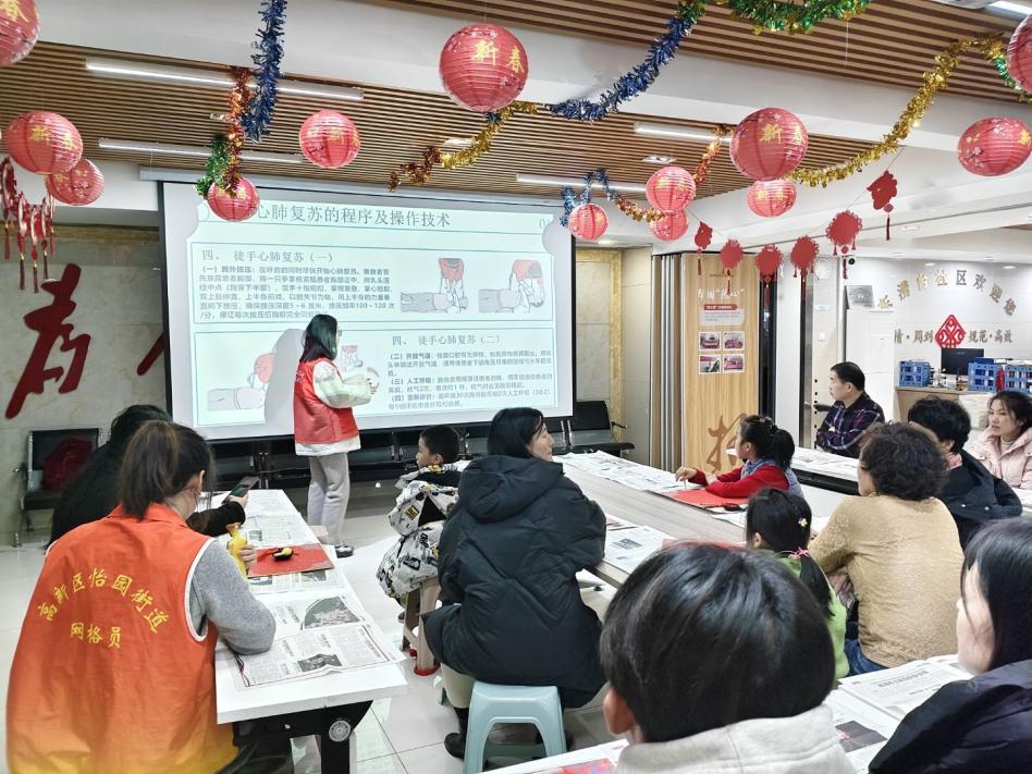 紧接着,活动进入心肺复苏知识讲解环节。宣讲成员从现场环境评估、意识判断、紧急呼救等步骤入手,系统阐释胸外按压的操作规范,重点说明按压位置、按压深度及频率要求,强调连续按压与胸廓充分回弹的重要性。同时,对人工呼吸的基本步骤进行讲解,提示开放气道及观察胸廓起伏等关键细节。围绕儿童心肺复苏操作特点,宣讲成员补充说明按压力度控制等注意事项,帮助家长形成科学认知。