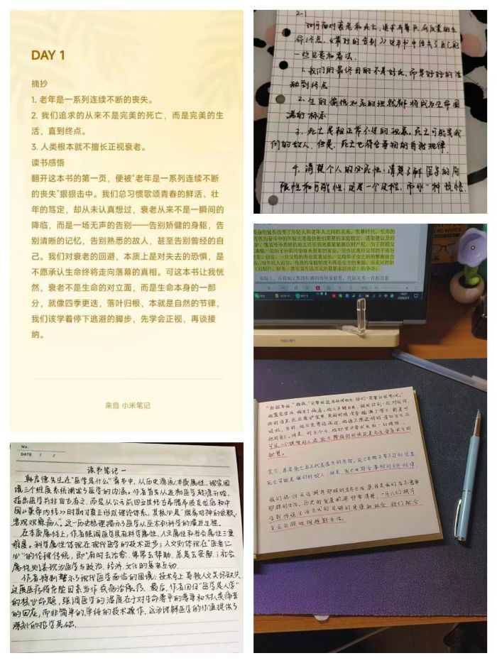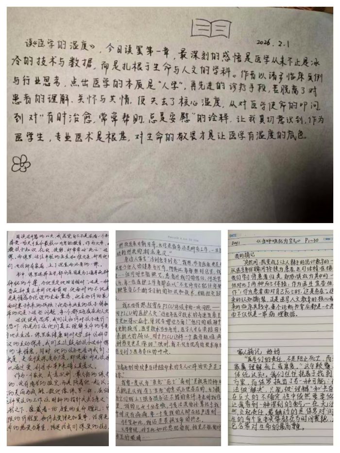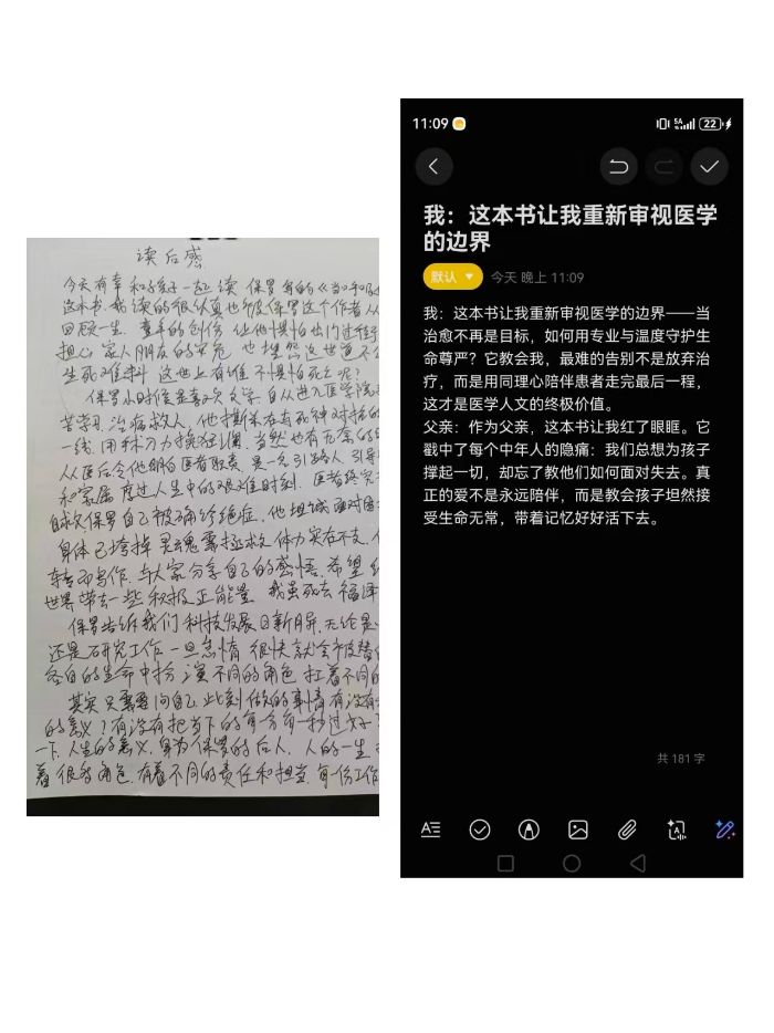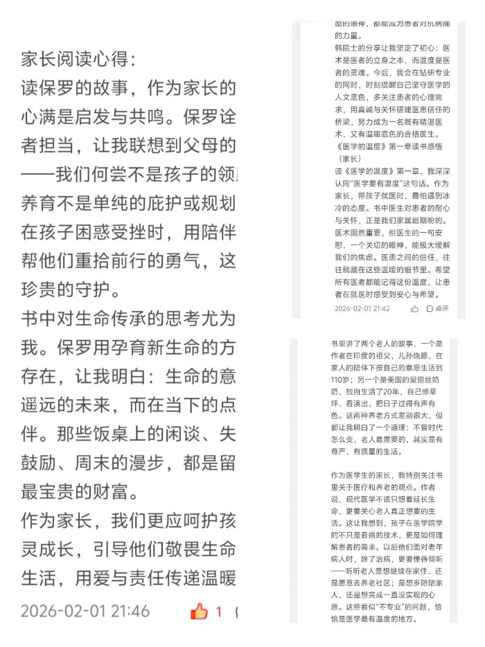 基于调研,团队精选《医学的温度》《千医百句》等书目,设计“每日共读45分钟+家庭日志记录+云端打卡”机制。学子与家长围坐共读时,既有对《伤寒杂病论》“治未病”思想的探讨,也有对现代医学“精准医疗”的思辨,更有对孩子医学之路的深度共情与理解。例如,有家庭在共读《医学的温度》“医患共情”章节时,父亲分享就医经历,孩子结合临床案例阐释“医学不仅是技术,更是对生命的敬畏”。截止活动结束,家庭日志累计达987篇,字里行间流淌着对医学人文的深刻感悟及家校协同育人的脉脉温情。