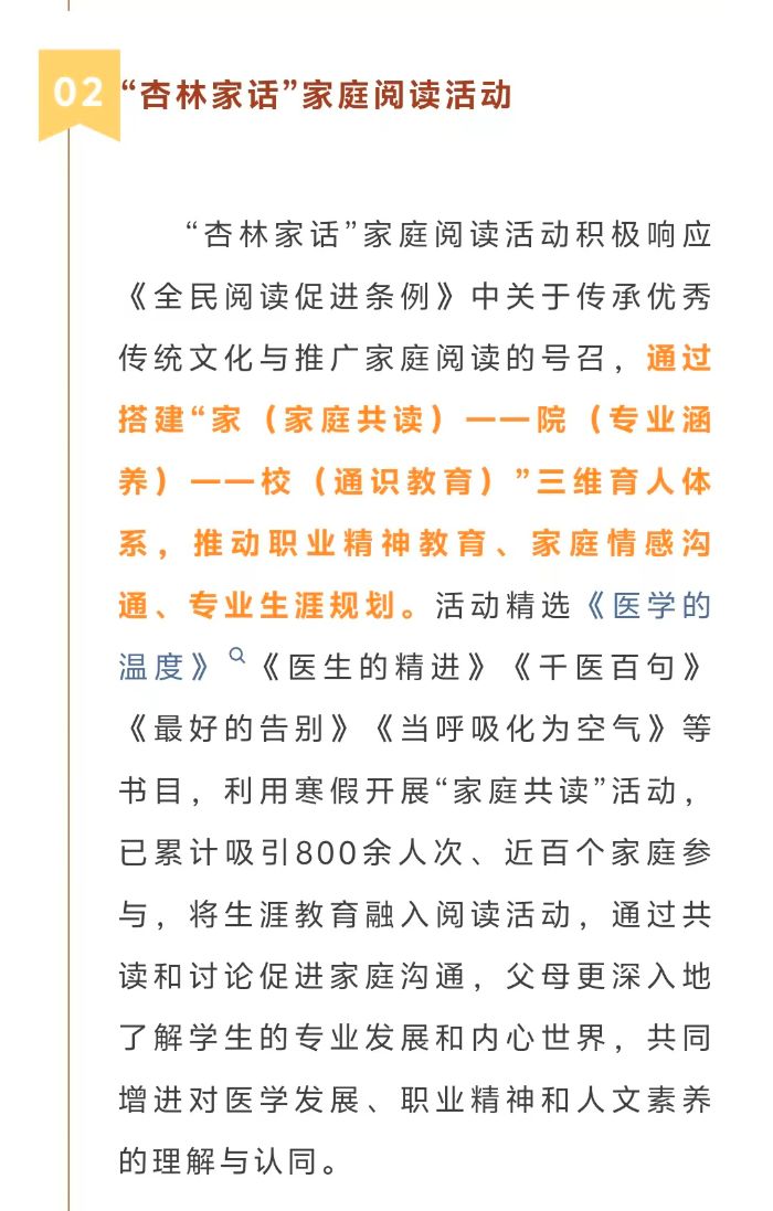 为响应《全民阅读促进条例》中促进优秀传统文化传承以及推广家庭阅读等号召,青岛医学院积极打造“杏林家话”阅读品牌,并于2月1日寒假期间发起“心归故里,阅见未来”家庭阅读实践活动。活动以“医脉传承”为核心,以“家庭共读”为桥梁,搭建“家—院—校”三维育人体系,吸引近百个家庭、800余人次参与,在校园内形成“以书为媒、以医为魂”的文化风尚。