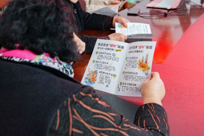 成员们手持新鲜与变质的生菜、包菜,直观展示食材变质特征,提醒大家“发霉食物即使切掉霉变部分也不能吃,霉菌毒素已扩散”。宣讲过程中,老人们不时凑近观察实物样本,认真记录关键要点,现场照片定格下老人们专注倾听、积极互动的生动瞬间。活动尾声,实践团为每位老人送上大字版科普手册,便于大家回家后查阅学习。