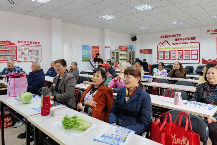 2月5日上午,民主路社区新时代文明实践站内座无虚席,不少老年居民早早到场等候。实践团成员带着新鲜蔬菜、保鲜膜等教具,以趣味问答拉开宣讲序幕。“哪种主食能预防便秘?”“空腹吃什么水果易刺激肠胃?”主讲人周柯宏用简单的问题迅速带动现场氛围,老人们踊跃举手作答。随后,周柯宏围绕健康饮食技巧、食材保鲜方法、健康食材辨别等核心内容展开讲解,结合广西饮食特色,重点示范了绿叶菜厨房纸包裹保鲜、腊肉密封冷藏、剩菜彻底加热等实操技巧。