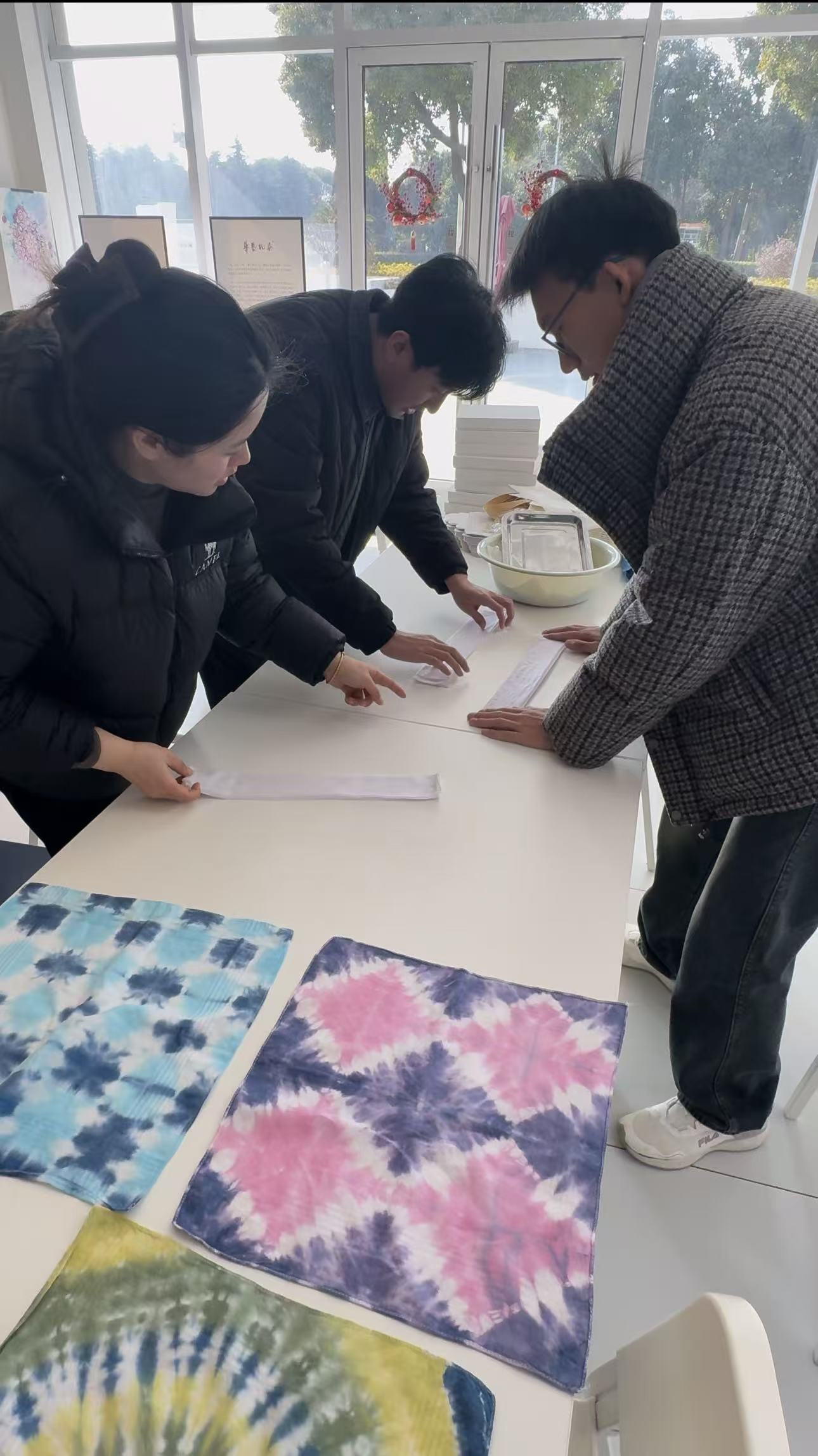 随后,在博物馆专业工作人员的悉心指导下,队员们系统学习扎染完整制作流程。大家充分发挥创意,动手尝试折、叠、捆、扎等基础技法,再将布料浸入靛蓝染料中耐心浸染。当小心翼翼拆开捆扎的绳线,一幅幅纹理独特、色彩雅致的扎染作品跃然眼前,队员们无不惊叹于传统技艺的神奇魅力,更在亲手创作中真切体会到扎染工艺的匠心巧思与实践乐趣。
