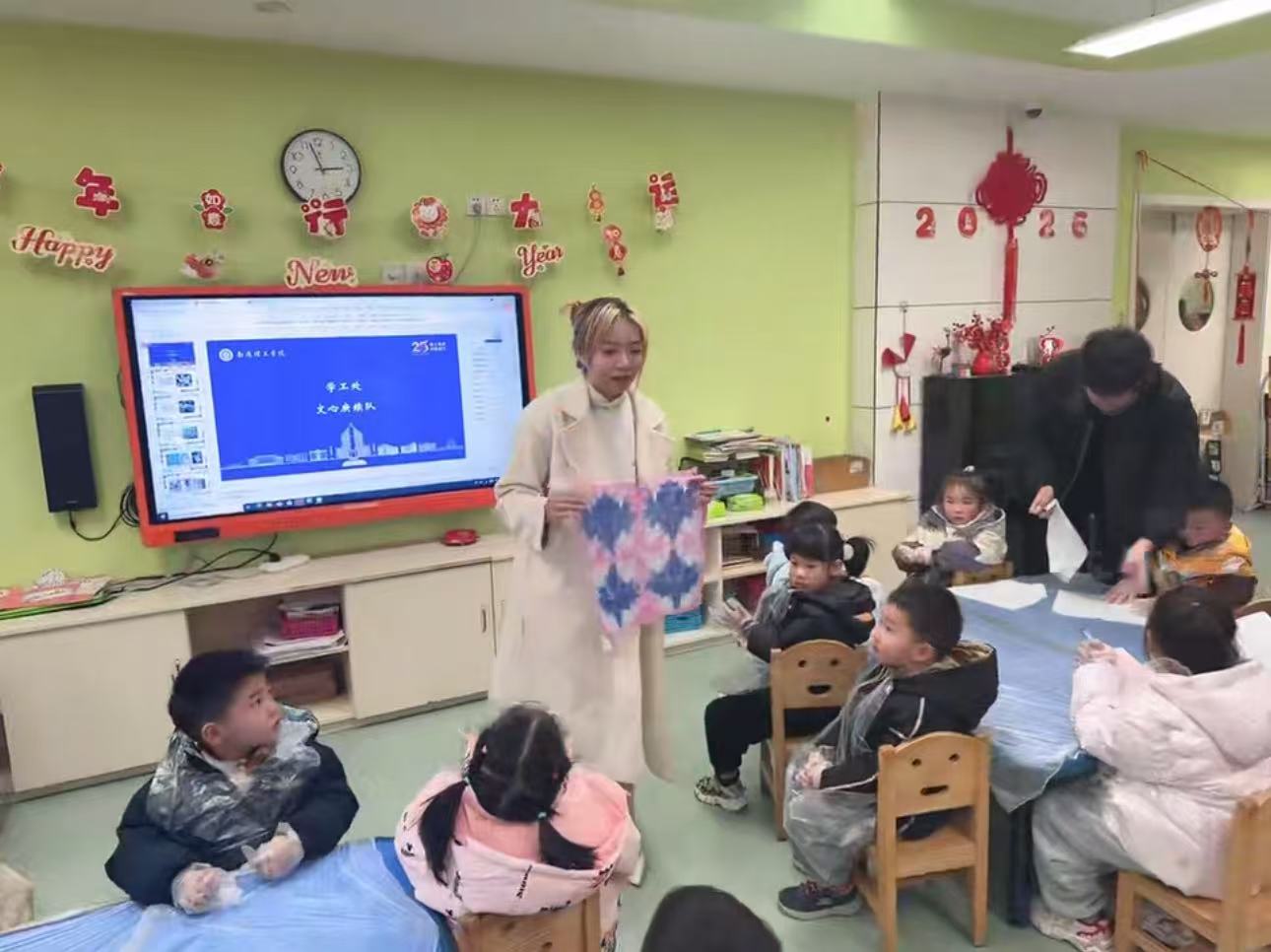 最后,团队走进海安市第一实验幼儿园,开展 “非遗进校园” 公益活动。队员化身 “非遗小老师”,用童趣化的语言向小朋友们讲述扎染的起源故事、制作原理,同步展示精心准备的扎染精品。在确保安全操作的前提下,队员们与幼儿园老师默契配合,带领孩子们体验基础扎染流程 —— 折布、捆扎、浸染、晾晒,一步步完成专属的扎染小手帕。当色彩斑斓的作品呈现在眼前时,孩子们的脸上洋溢着满满的喜悦与成就感。此次活动以趣味体验的形式让非遗文化走进孩童世界,在新生代心中悄然种下文化传承的种子。