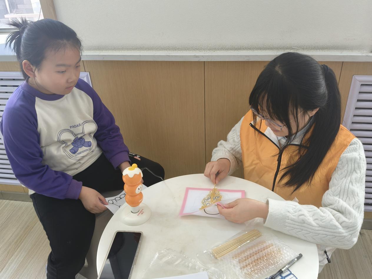 下午三点,济南市历下区东关街道社会工作服务站刘老师为同学们带来非遗糖画制作体验。刘老师向孩子们介绍了糖画的历史渊源与制作工艺,并现场示范绘制步骤。随后,小朋友们在志愿者的耐心协助下,手持热熔工具,按照图纸细心描绘,完成了各具特色的糖画作品。通过亲手体验传统技艺,孩子们在实践中感受到非物质文化遗产的独特魅力,也在心中播下传承中华优秀传统文化的种子。