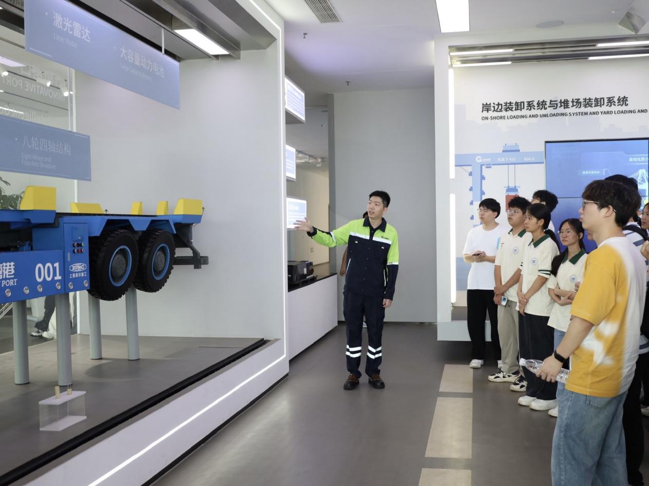 为讲解员为同学们介绍码头的自动化设备及运行原理(通讯员杨婷媛摄)