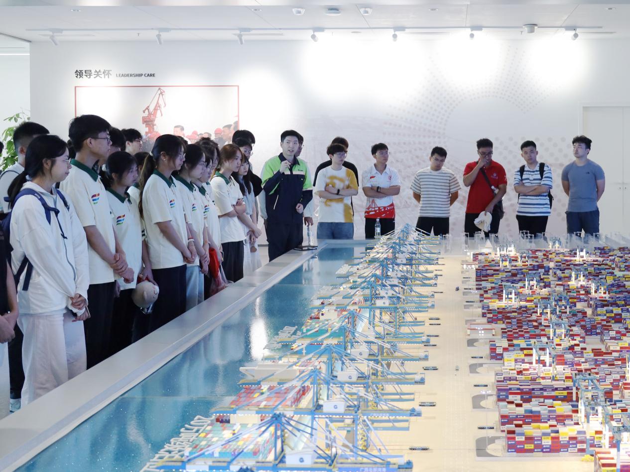 在沙盘与视频展示中,实践团成员直观了解到码头的硬核实力:如今,中国港口吞吐量稳居世界第一,北部湾国际门户港作为“一带一路”重要节点,创新采用全球首个U型工艺布局,建成全国首个海铁联运自动化集装箱码头,服务西部陆海新通道。