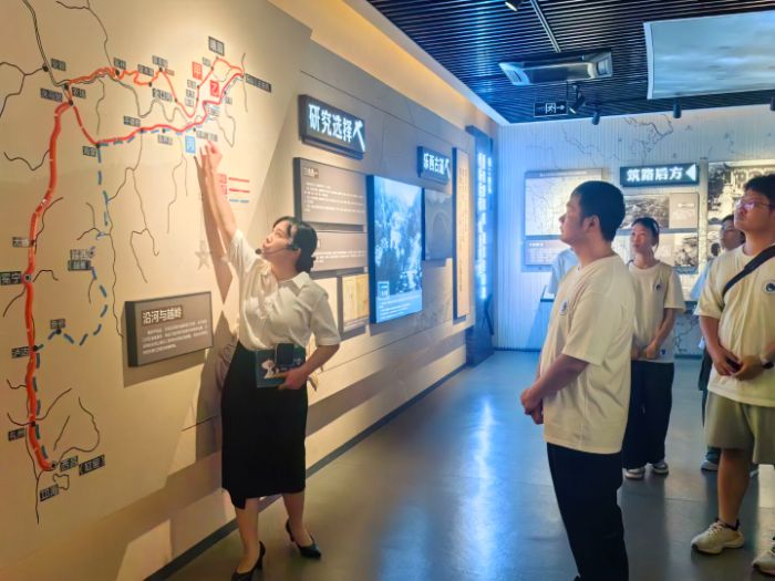 图为乐西抗战公路纪念馆讲解员为实践团队介绍筑路历史背景。江天一 供图