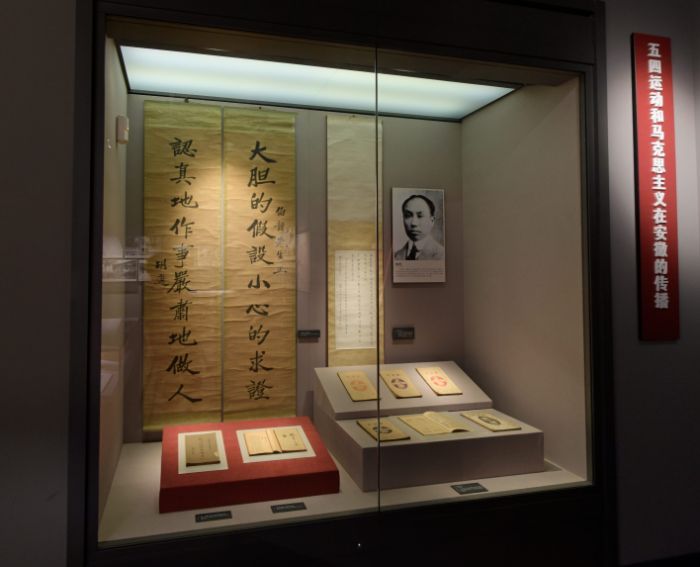 接着往里走,就是第一个专题——革命赓续 安徽建党。鸦片战争后,中国逐步沦为半殖民地半封建社会。清廷的腐朽统治与西方列强的殖民压榨,造成安徽人民饥寒交迫,苦不堪言。为实现民族独立与国家富强,安徽人民奋起抗争,拉开反帝反封建斗争的序幕。五四运动后,马克思主义与中国工人运动相结合,诞生了中国共产党,中国革命面貌从此焕然一新。安徽地方党组织建立后,成为领导安徽人民进行新民主主义革命斗争的核心力量。