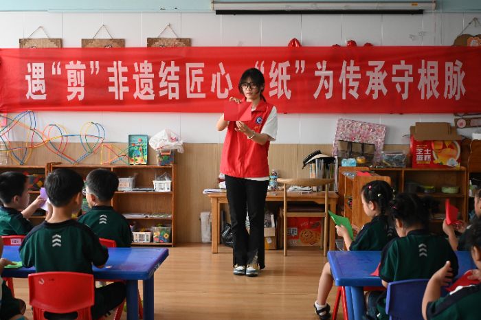 幼儿园里,队员们带来了红纸与安全剪刀,开启“剪纸里的红色故事”趣味课堂。队员们边教孩子们剪五角星、八角帽,边讲简单的红色小故事。老师李娜笑着说:“这样的课比课本里的故事更让孩子有感触。”