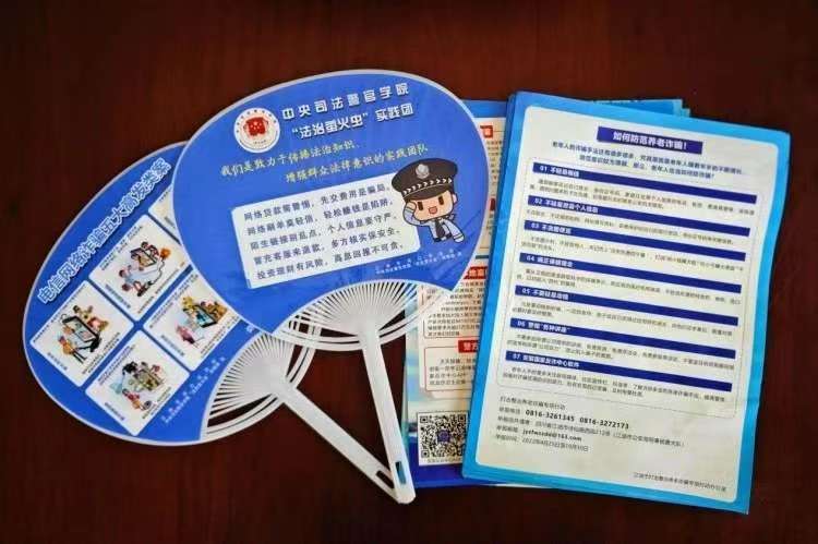 图为实践团设计制作的反诈宣传扇和联合河口司法所发放的反诈宣传页