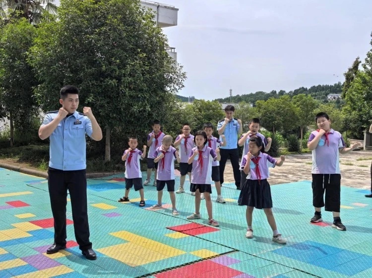 警体拳教学环节同样热闹。实践团成员先示范“摆拳”、“格挡”等基础动作,再逐一分步讲解发力要点。“这不是用来打架的,是遇到危险时保护自己的本事。”实践团反复强调。孩子们跟着口令出拳、防守,虽然动作略显笨拙,眼神里却满是认真。