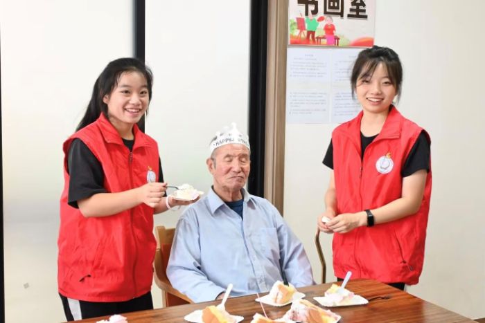 7月23日,志愿者们带着提前准备的生日蛋糕与画具来到养老服务中心。当蜡烛点亮、生日歌响起,本月过寿的几位老人围坐桌前,脸上满是惊喜与笑意——志愿者们特意记得老人们的生日,专程为他们补过集体生日。切蛋糕时,志愿者细心地帮老人把蛋糕分成小块,递到手中;许愿时,有老人笑着说“有你们在,比啥都热闹”,简单的话里满是欣慰。