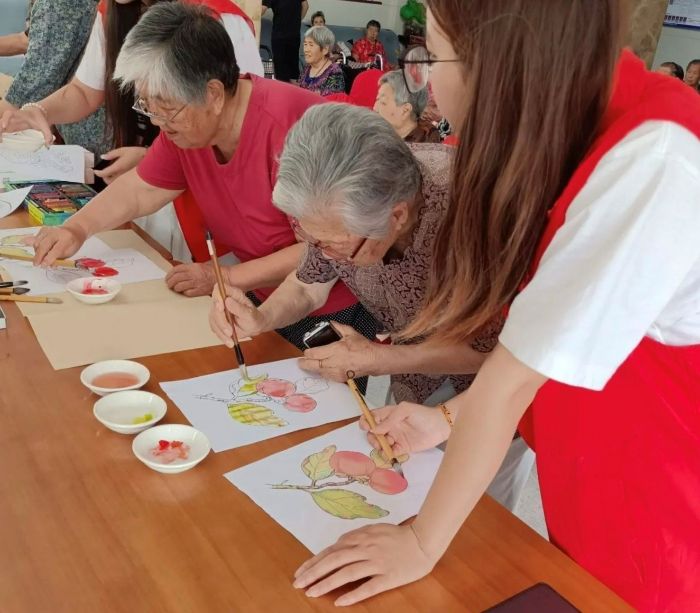 除了温馨的生日会,志愿者们还拉着老人坐在暖阳下唠家常。从年轻时的工作趣事到如今的日常点滴,老人们慢慢讲,志愿者们认真听,偶尔插句关心的话,不大的院子里满是细碎的笑语。随后铺开画纸,志愿者们陪着老人一起画画:有的教老人勾勒简单的花草,有的帮着调颜料,还有老人凭着记忆画出旧时的院落,志愿者们围在一旁轻声称赞,笔尖下的色彩与老人的笑容相映,成了当天最暖的景。