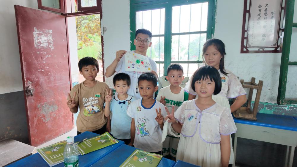 上午10点50分,“卷轴魔法”活动将现场气氛推向高潮。志愿者们铺开长达5米的画布,孩子们用五彩颜料在画布上按下自己的手印,再用画笔添画太阳、星星、花朵等图案。“这是我们共同的‘梦想画布’,每个人的手印都是一颗独一无二的星星。”支教队员陈芯彤笑着向孩子们解释。当布满手印与画作的画布被悬挂在教学楼走廊时,孩子们争相在画布前寻找自己的印记,叽叽喳喳的讨论声充满了童真与欢乐。