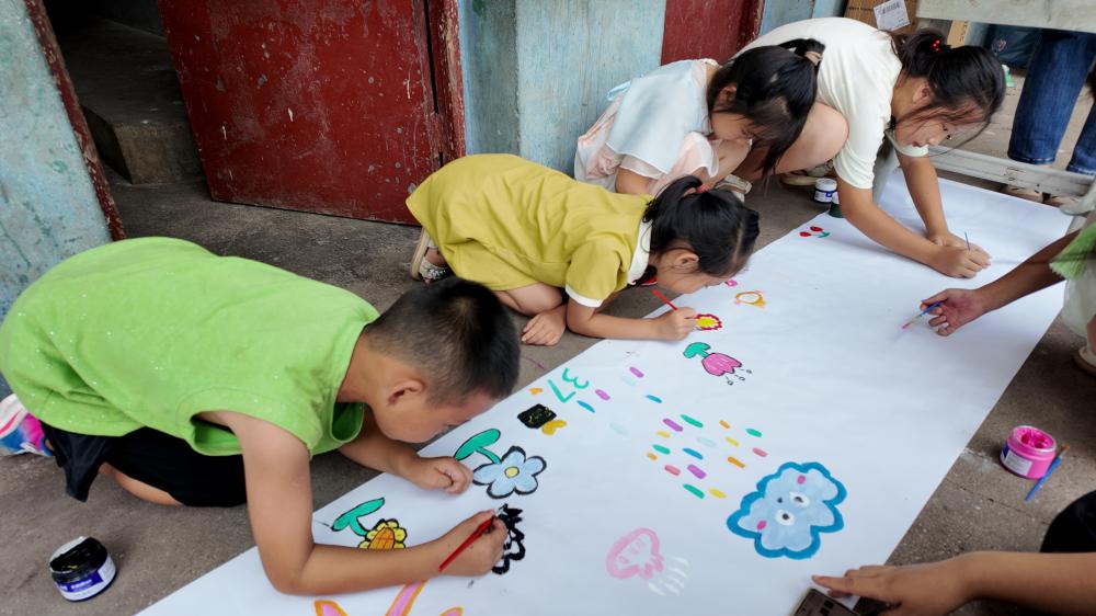 随后的“共绘夏令营”活动中,志愿者与孩子们共同拿起画笔创作长幅画作,“望曦”“七朵有彩花”“快乐大本营”等元素在五彩颜料下绽放,每一笔都饱含留恋,大家围绕长卷合影,定格协作的快乐与珍贵瞬间。