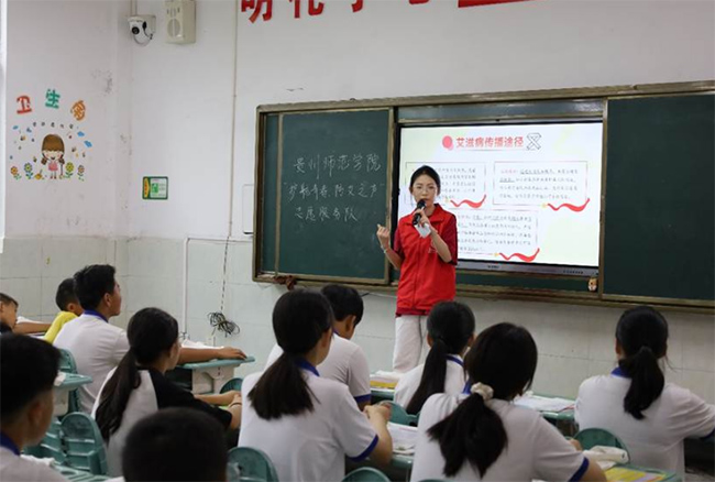 (图为贵州师范学院“护航青春防艾之声”队员在中学进行禁毒防艾与青春健康综合宣讲。邹贤杰 供图)