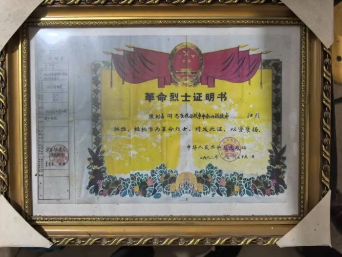 图为陈述善烈士的烈士证(胡嘉轩供图)