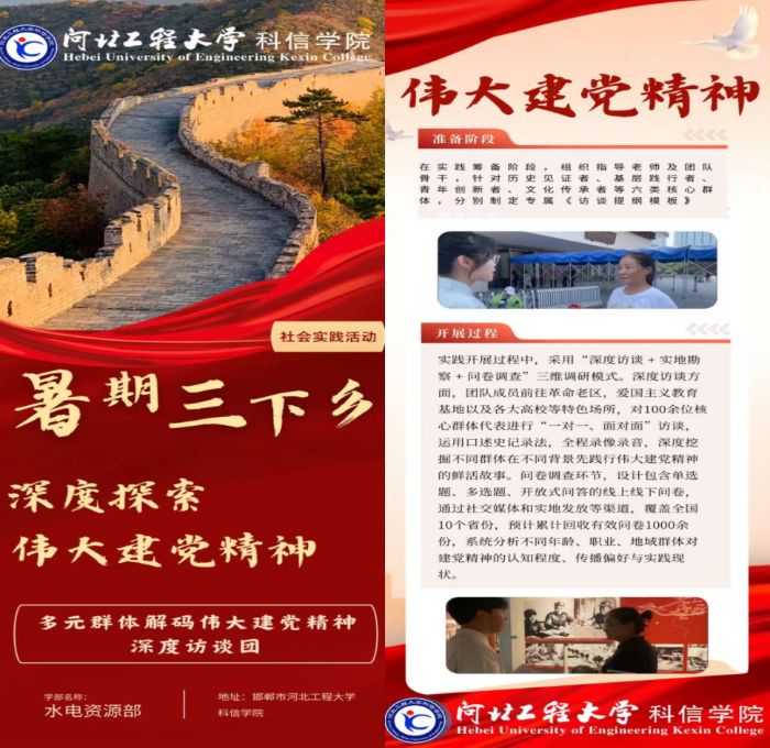 8 月 5 日,河北工程大学科信学院 “多元群体解码伟大建党精神深度访谈团” 暑期 “三下乡” 活动圆满收官!历经一月有余,团队足迹遍布邯郸晋冀鲁豫烈士陵园、邯郸市博物馆等红色地标,深入百家村等乡村及多所高校,完成对红色场馆游客、老党员、青年学子等多类群体的深度访谈,积累 100 余场访谈记录与 1000 余份调研数据。实践中,团队创新构建 “实地访谈 + 基地讲解 + 社会调研 + 多元传播” 模式,既通过话剧展演、诗词朗诵活化红色记忆,更形成《访谈实录册》《伟大建党精神解码手册》等成果,让精神传承更接地气。此次实践不仅筑牢了队员的信仰之基,更探索出红色精神代际传递的新路径,为青年学子践行伟大建党精神写下生动注脚。