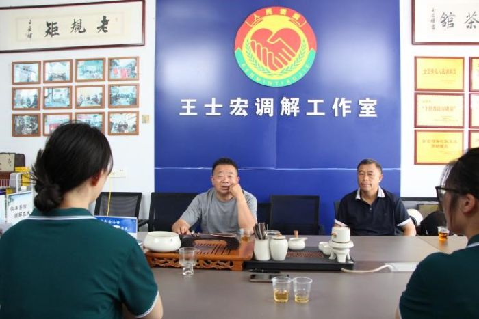 图为“红心润心团队”在王士宏调解工作室了解“一杯茶”调解法