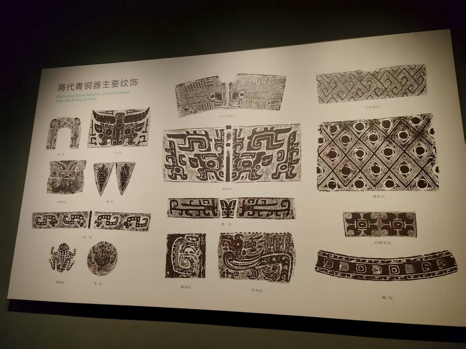 图一,拍摄于河南博物馆展厅4中原立国——夏商时期,图中为现代学者根据出土文物复现的商代青铜器主要纹饰