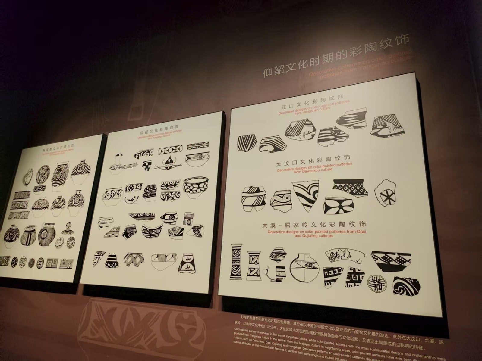 图三,拍摄于河南博物馆展厅1新时期时代,图中为现代学者根据出土文物复现的仰韶文化时期的彩陶纹饰,展现了公元前5000年至前3000年黄河中游地区彩陶的分布和主要图案