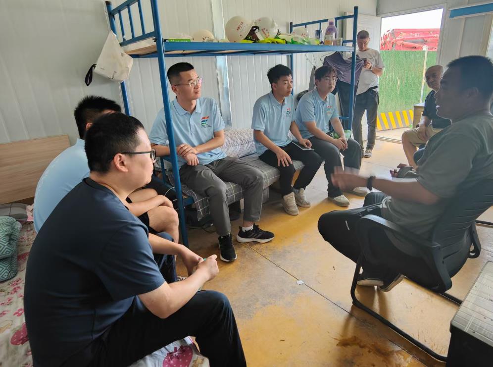 参观结束后,一行人来到项目部的招待室,展开了一场深入的交流。大家围绕工程建设过程中遇到的实际问题展开讨论,接待人员坦诚地分享了近期面临的拆迁难题,从问题的产生到解决的思路,毫无保留地向同学们传授经验。同学们也从中学到了工程建设不仅需要专业技术,还需具备应对各种复杂情况的能力。全体人员在项目部合影,为此次三下乡企业访问画上句号。实践队走出校园深入工程一线,了解先进工艺与流程,汲取实践经验,直观认识专业,为就业补充实际认知,将以此次活动为动力,提升素养,助力工程建设。